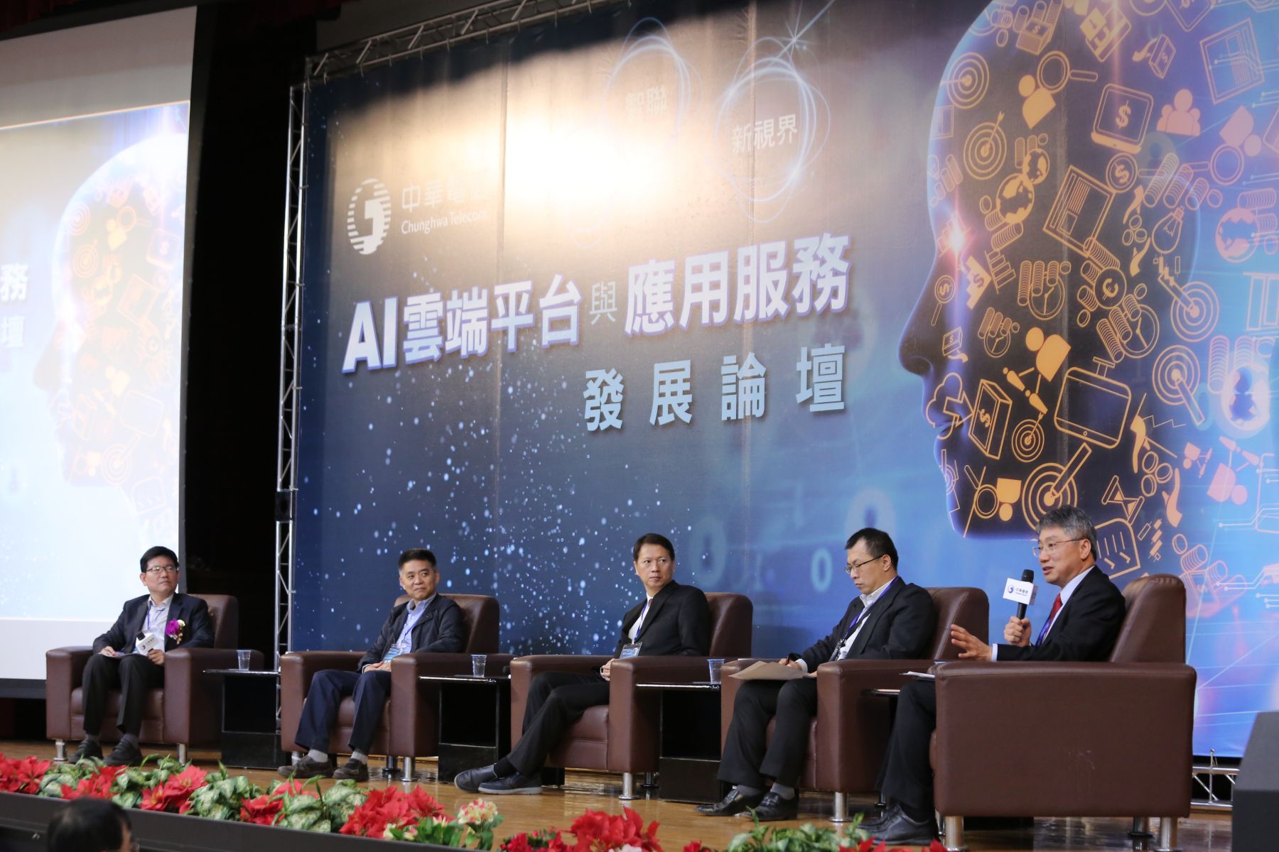 (右到左)中華電信研究院副院長陳榮貴、東海大學電子計算機中心主任楊朝棟、趨勢科技研發副總暨人工智慧加速計畫主持人周存貹、國網中心計算基礎設施服務計畫主持人朱賢良、中華電信研究院院長林榮賜